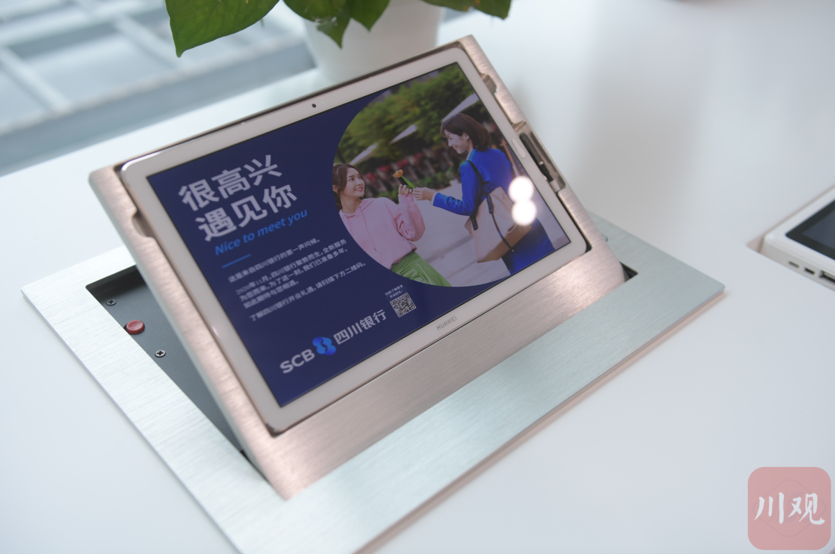 四川银行总行的营业部大厅在设计理念上,网点注重科技元素运用,打造温馨舒适的科技智慧网点。靠墙位置设有立式智能柜员机,上方是感应屏,当人走到机器前就会由广告宣传切换为机具功能介绍,客户可以在这个区域自助办理开卡、转账、签约、激活等业务。在靠窗的明亮位置设有自助平板电脑,可以自助升降,透明的桌腿使台面看起来像是悬浮在空中。一体化家具设计与环境融为一体,让客户服务感受更好。