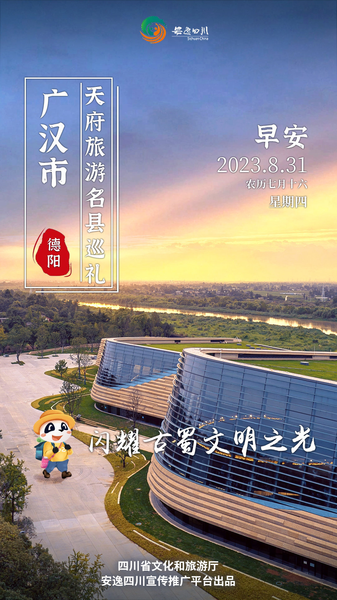 8月31日,星期四。今天安逸四川日历海报“天府旅游名县巡礼”走进德阳广汉市,感受古蜀文明之光。