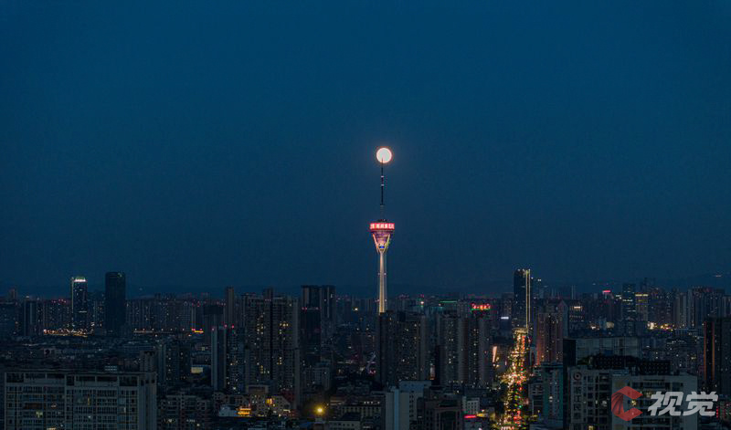 8月30日晚,一轮橙红色的超级大月亮高高地挂在蓉城上空,皎洁明亮。C视觉摄影师 龚全意 摄
