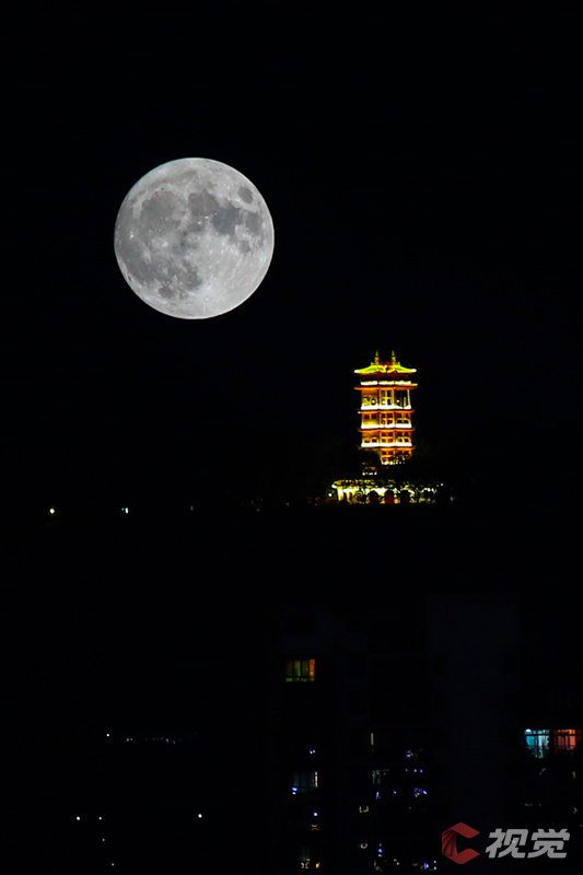 8月30日晚,宜宾城市上空的超级“蓝月亮”(二次曝光拍摄)。C视觉摄影师 庄歌尔 摄