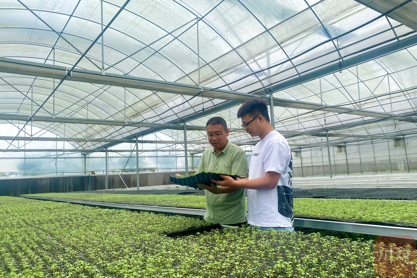 工作人员在智能育苗大棚中查看油菜苗生长情况。吴迪 摄