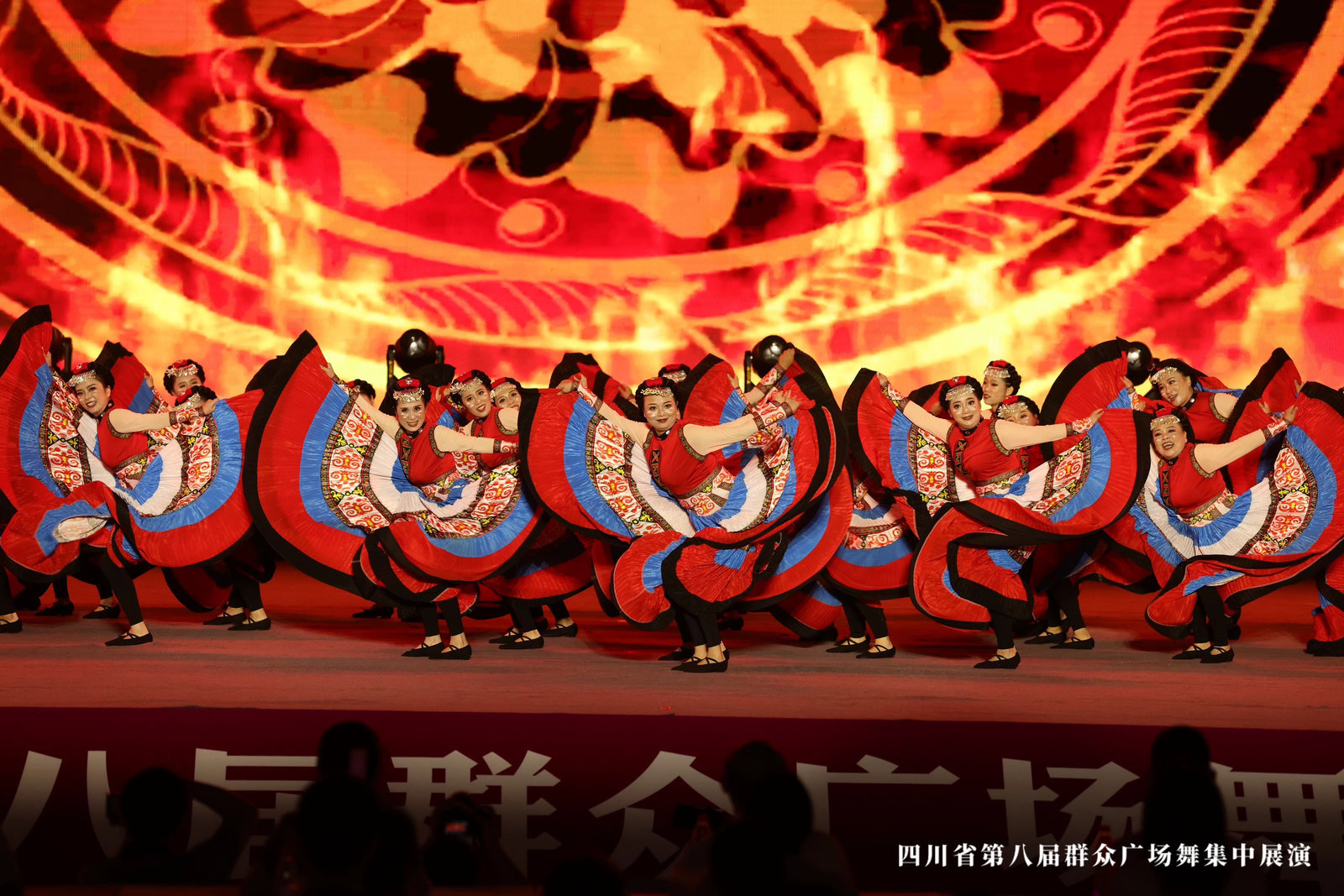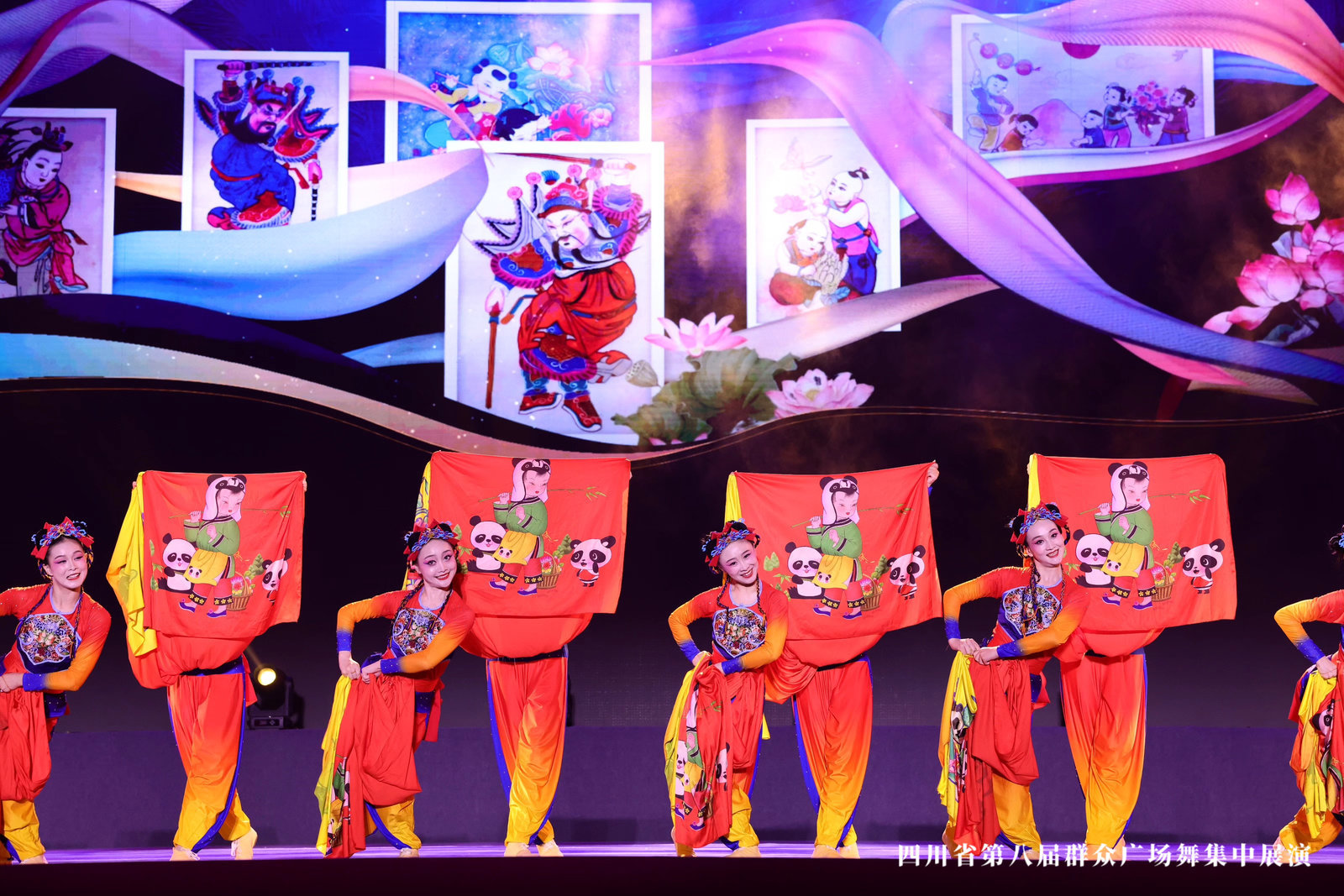德阳市文化馆馆长刘桃介绍,广场舞《年画村里幸福歌》以国家非物质文化遗产绵竹年画为主题,通过五彩斑斓的色彩和明快的动作带领现场观众漫步年画村,身临其境感受人在“画中游”。把年画印在演员们的腰带和裙摆上,随着舞蹈的变换,撩起不同的裙摆,风格迥异的年画就展示在舞台。