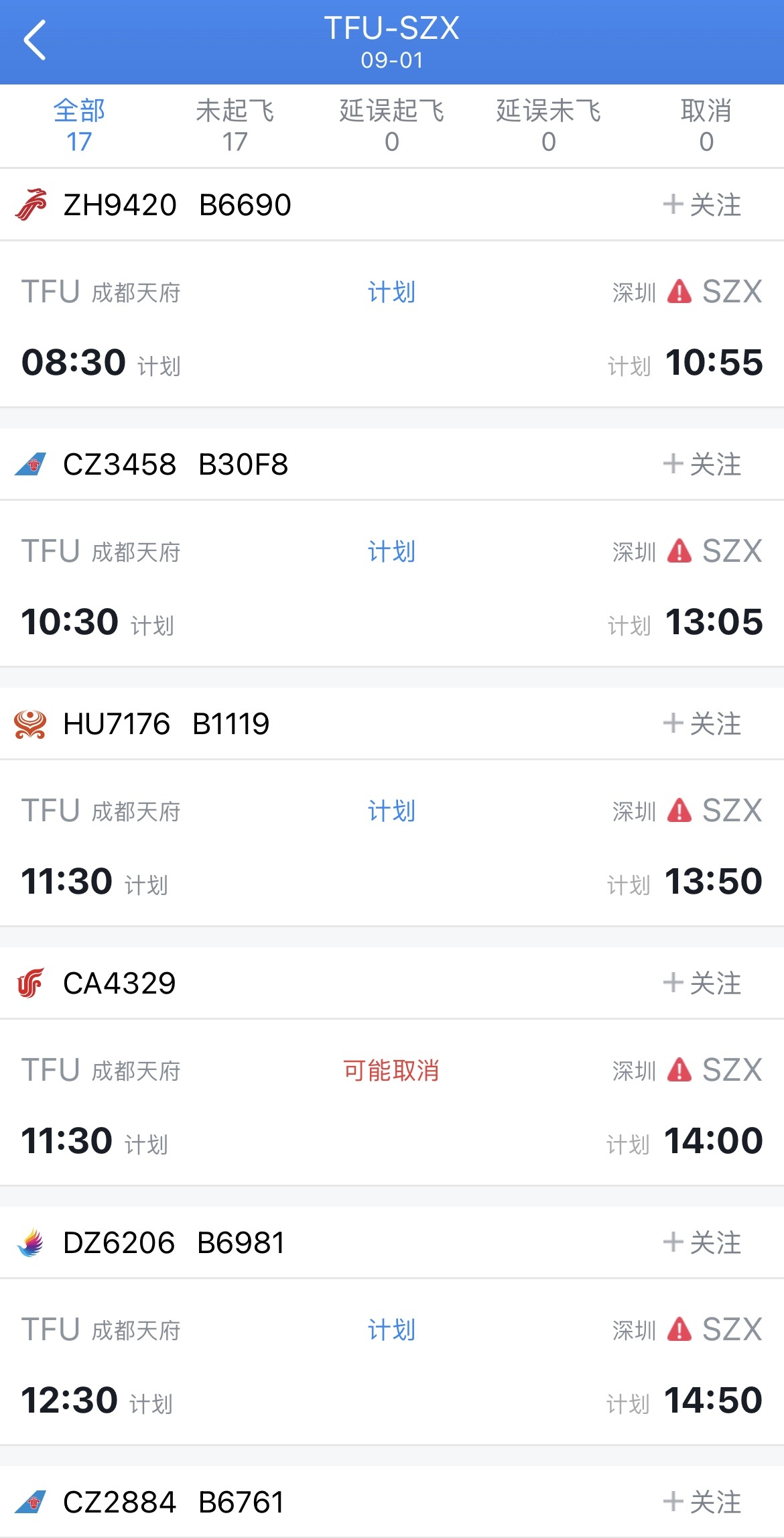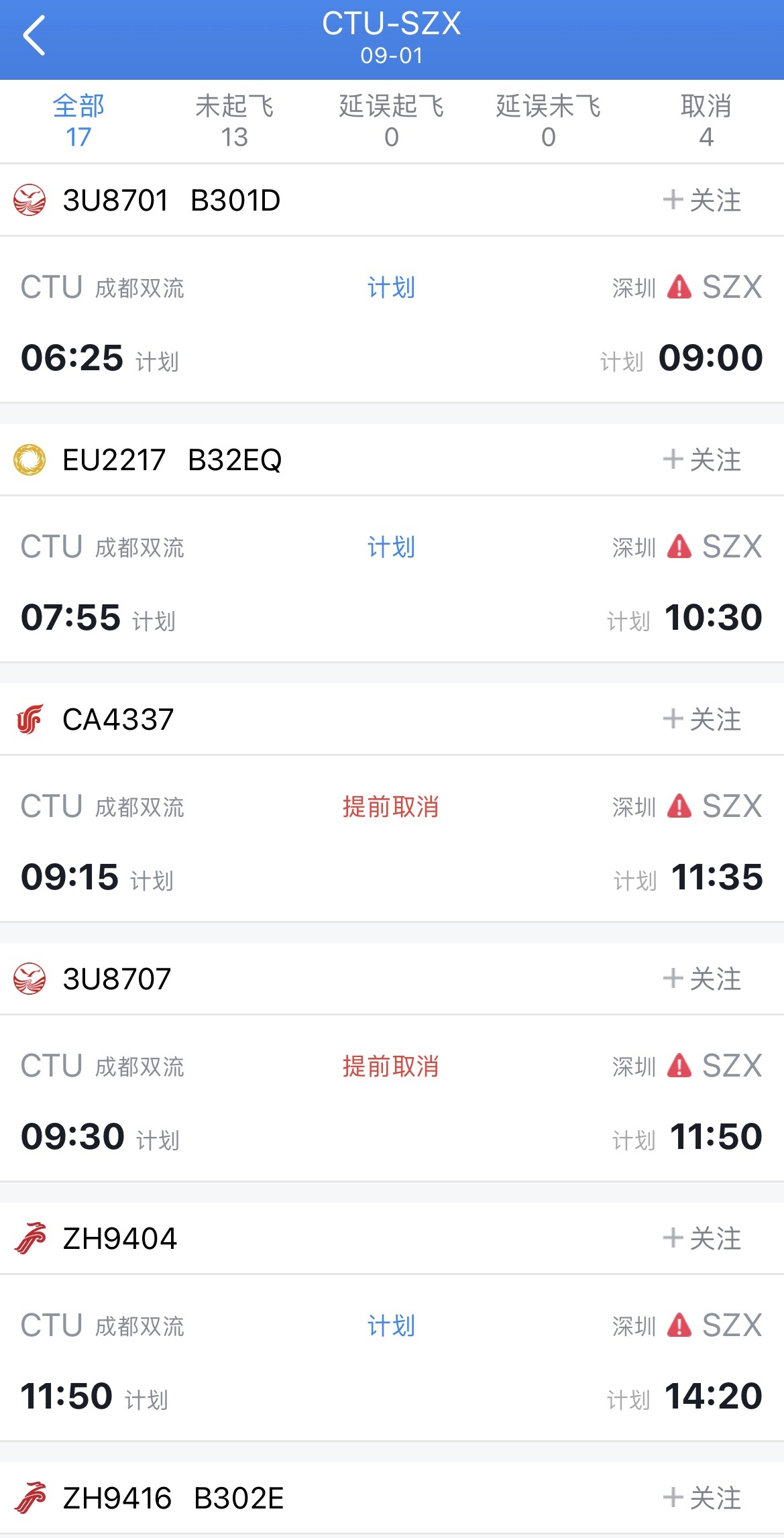 8月31日,记者通过飞常准平台查询了解到,9月1日成都飞深圳共有34个计划出港航班,由成都天府、成都双流机场起飞的计划出港航班各17个。截至下午4时30分,这些计划航班信息都标注了红色提示信息称,受台风影响深圳宝安机场将于9月1日12时起暂停航班运营,其中成都双流飞深圳的4个航班已提前取消。