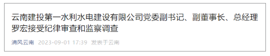 据省纪委监委驻省国资委纪检监察组、楚雄州监委消息:云南建投第一水利水电建设有限公司党委副书记、副董事长、总经理罗宏涉嫌严重违纪违法,主动投案,目前正接受省纪委监委驻省国资委纪检监察组纪律审查;经云南省监委指定楚雄州监委管辖,正接受楚雄州监委监察调查。