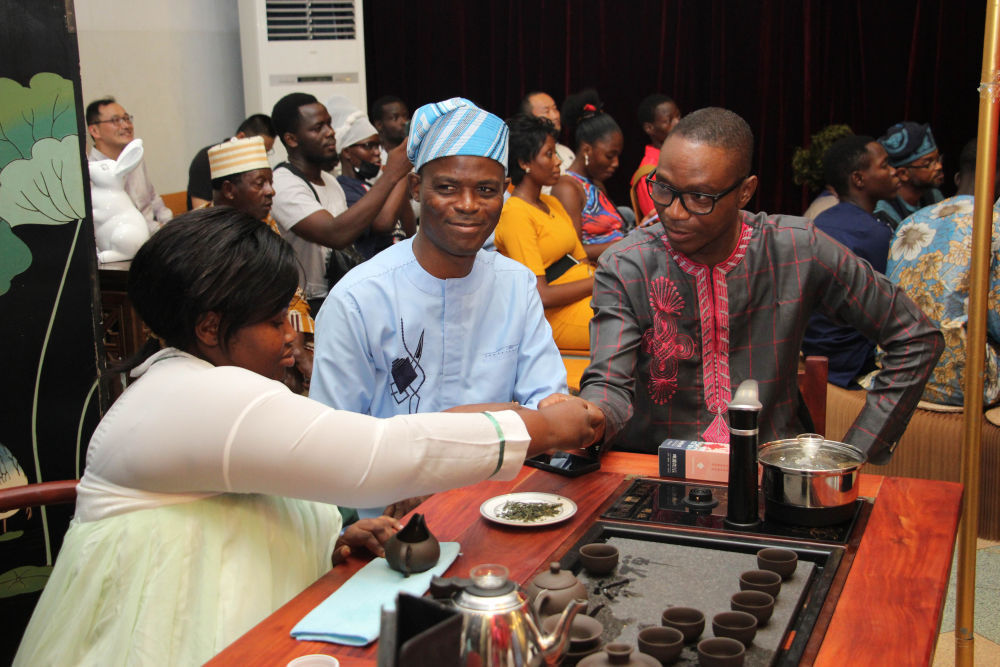 人们在贝宁科托努贝宁中国文化中心“茶和天下·雅集——青岛有礼”文化交流活动上品茶。