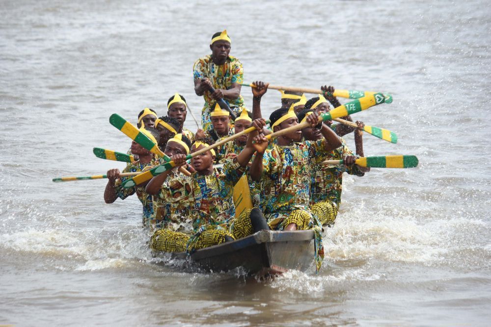 8月26日,贝宁科托努的冈维埃水上村庄,人们身着多彩服饰参加独木舟赛。