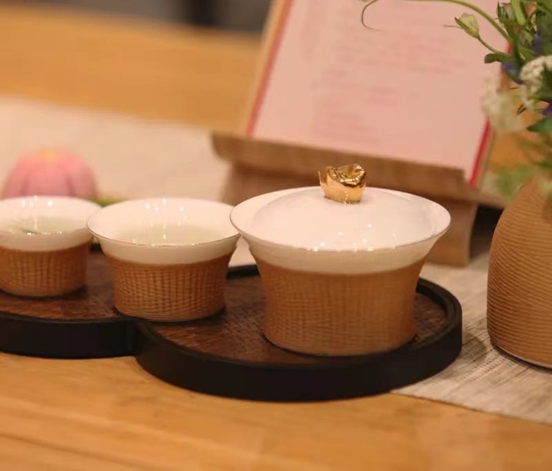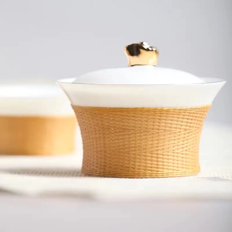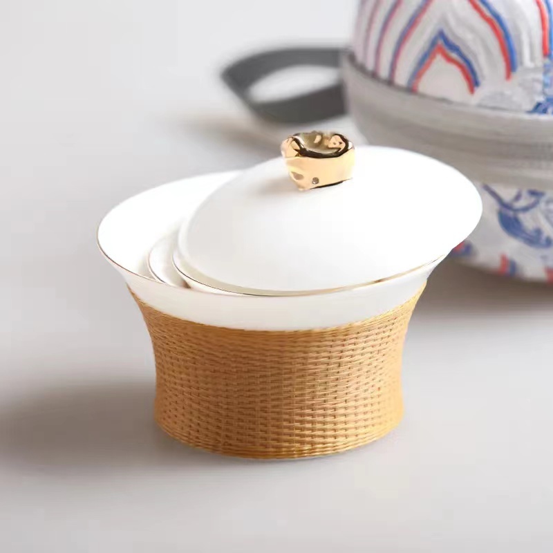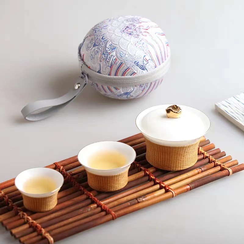 据渠县刘氏竹编负责人刘嘉峰介绍,《锦绣之旅》是一款便携式旅行茶具。瓷胎竹编为四川特色的非遗手工技艺,壶钮为盆地造型,代表着四川盆地的地形地貌,包装则为蜀锦元素。