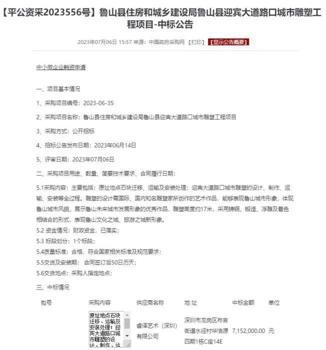 中国政府采购网公开的中标公告显示,这座位于鲁山县迎宾大道路口城市雕塑工程项目,中标金额达到715.2万元,资金情况为“财政资金,已落实”。