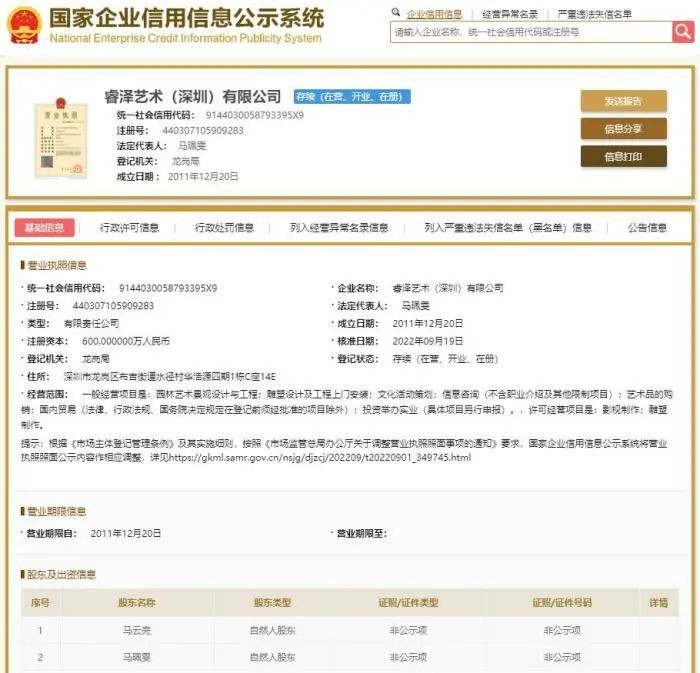 国家企业信用信息公示系统显示,睿泽艺术(深圳)有限公司成立于2011年12月,法定代表人为马珮雯,注册资本600万人民币。公司由马云亮、马珮雯共同持股,马云亮持股75%,为公司实控人。