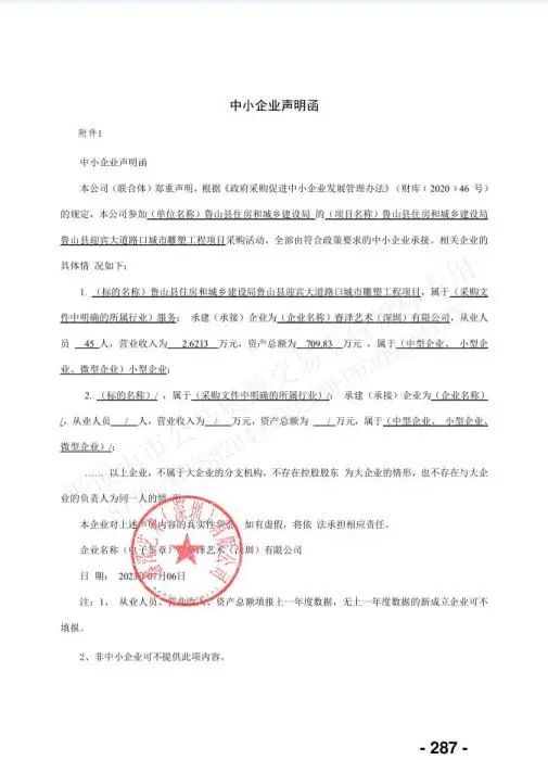 中标公告所附的中小企业声明函显示,睿泽艺术(深圳)有限公司从业人员45人,营业收入2.6213万元,资产总额为709.83万元。