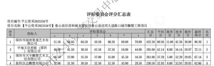 而在中标公告附件“各评委对所有投标人投标文件的分项评分明细”中,全部7名评委一致给睿泽艺术在企业信誉一栏打了满分3分,另外三家参标公司该项得分均为0分。