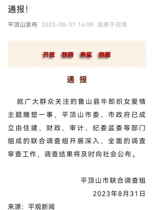 8月31日,“平顶山发布”公众号发布通报,就广大群众关注的鲁山县牛郎织女爱情主题雕塑一事,平顶山市委、市政府已成立由住建、财政、审计、纪委监委等部门组成的联合调查组开展深入、全面的调查审查工作,调查结果将及时向社会公布。