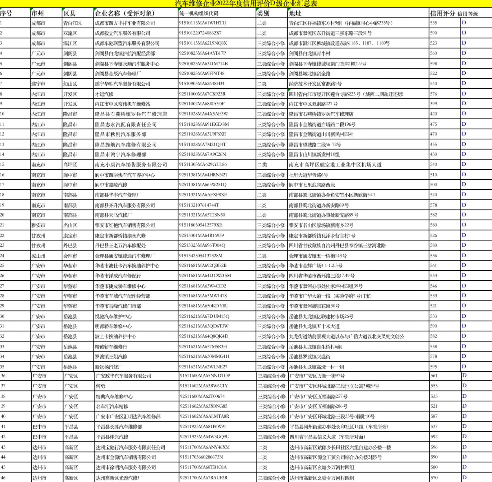 46家川内汽车维修企业2022年度信用评价D级企业名单。点击可查看大图