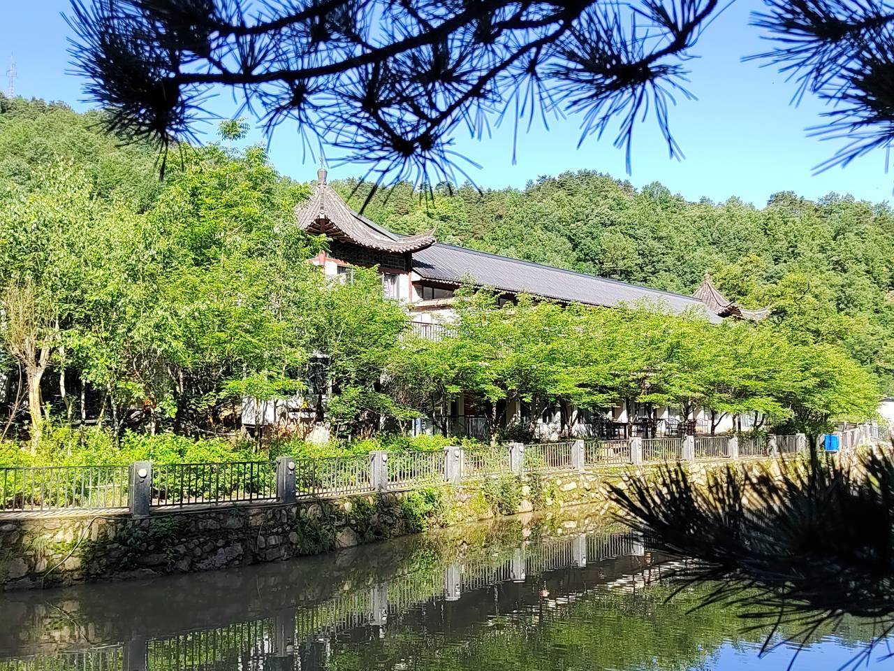 沿着平坦的沥青路上行,在一处山谷中,树木掩映下白墙灰瓦的小楼映入眼帘,古朴别致。