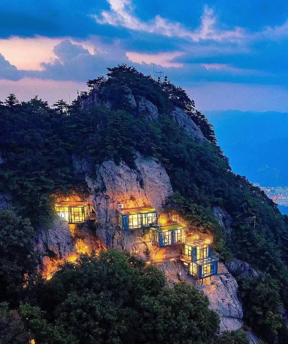 老君山脚下的畔山民宿,顶楼全部是玻璃做成的“星空屋顶”,入夜,床在天中,星在眼中,一、二、三、四……数不清的星星进入梦境中。