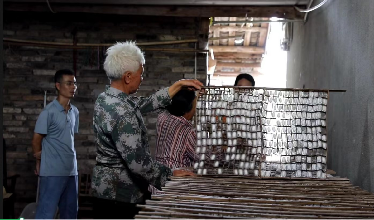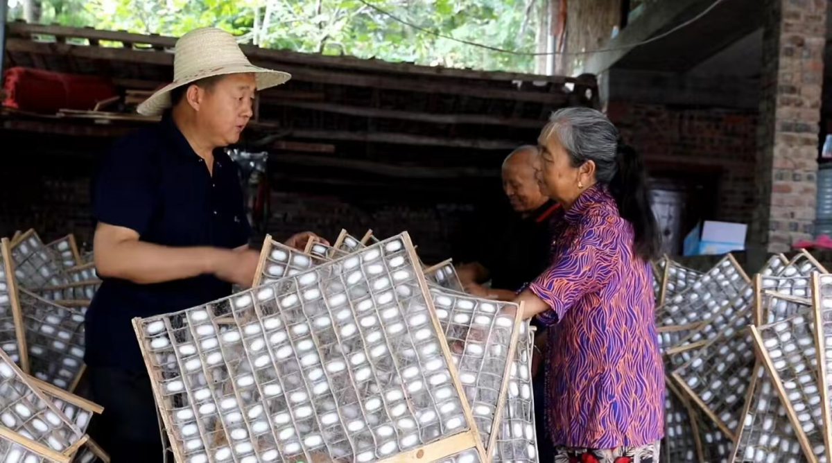 观义镇银针村气候温润,自古就有采桑养蚕的习俗。近年来,该镇因势利导,大力发展蚕桑产业,积极培育蚕桑专合社、家庭养蚕农场、养蚕大户等新型经营主体,提高蚕桑综合效益。蚕桑技术员为养殖户提供产前、产中、产后服务,及时解决蚕桑生产中的技术难题。全村发展大小蚕桑养殖户200余户,实现产业助农增收。这段时间,养殖户的蚕房里挂满了养蚕的方格橱,方格橱的格子上已经结满了雪白的蚕茧,蚕农们正在对蚕茧进行清理杂质、打扫卫生,为出售蚕茧做好准备。观义镇银针村村民马朝林说:“我们家栽桑树10亩,每一季养5张蚕,一年养20张,今年秋季的蚕茧丰收了,每张纸平均的产值是二千七八,我们养蚕的农户都满意。”