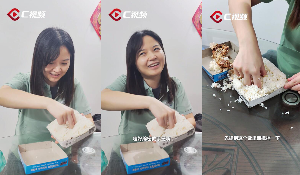拿到餐盒后,照着网上的教学视频,拿出拇指、食指和中指,一边搓揉一边搅拌,再抓起一把送进嘴里,层次丰富的味道,加上特别的香料气息,令人欲罢不能。