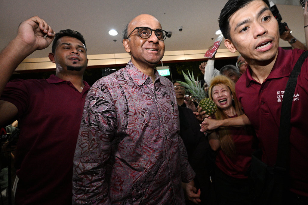 9月1日,新加坡总统候选人尚达曼(前中)在裕廊与支持者等待总统选举结果揭晓。图据新华社