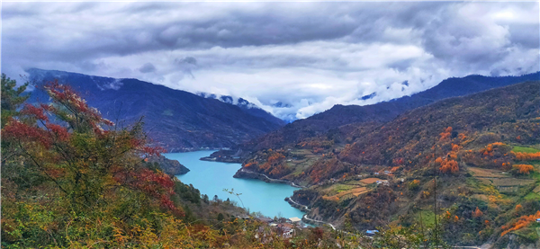 网友@淡然 在雅安雨城区“寄”来了硗碛湖旁彩林掩映人家的温暖秋景~