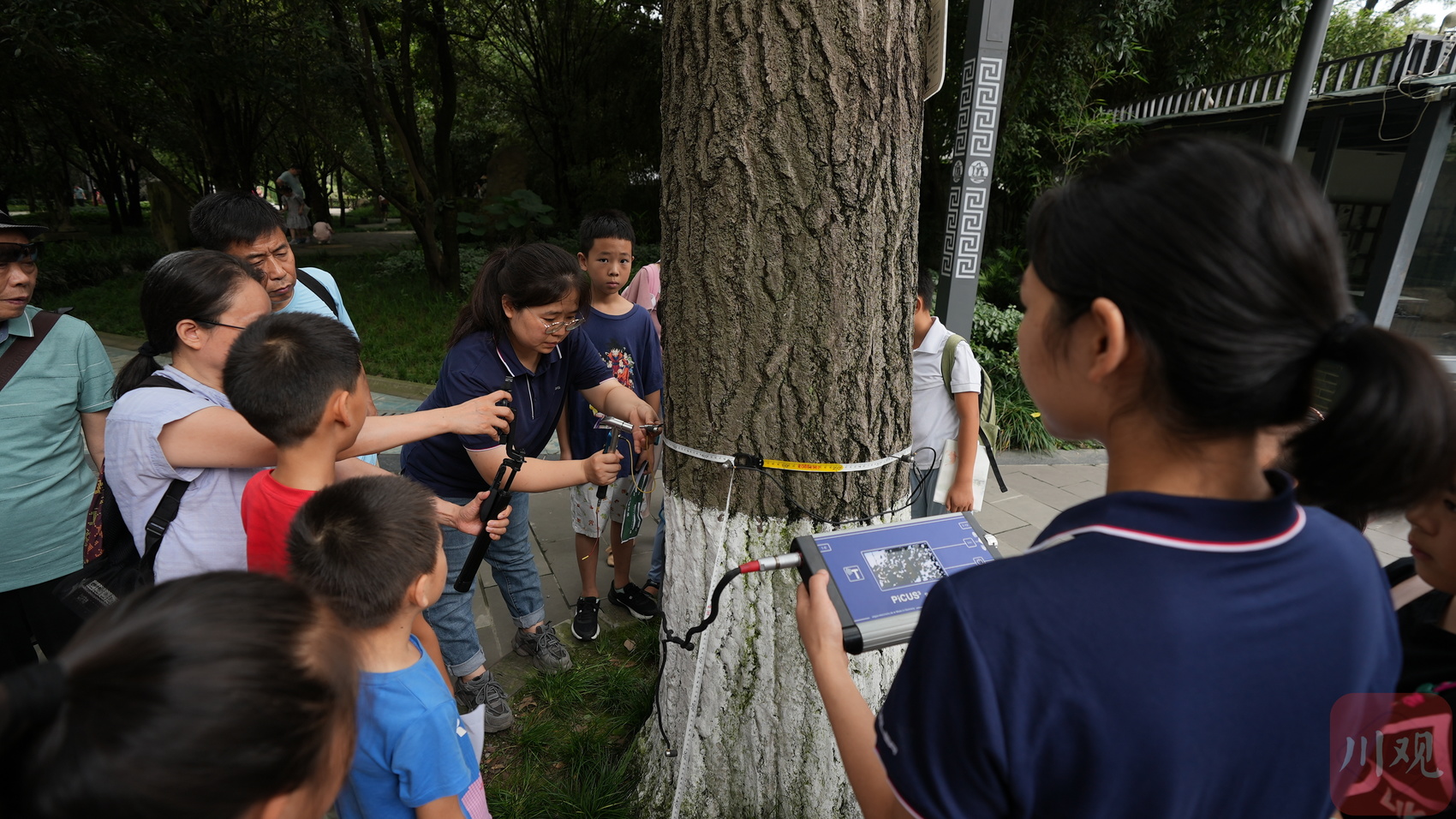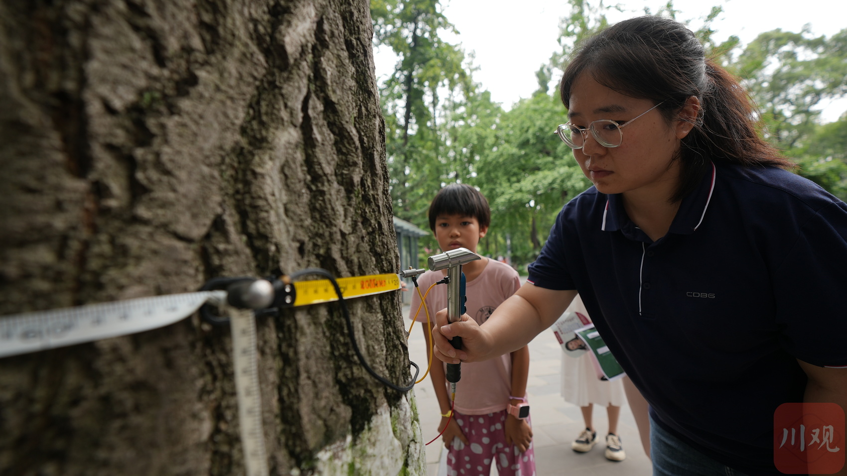 最后,要通过专业仪器,进行树干断层扫描。为了固定检测仪,工作人员敲击钢钉嵌入树身,随后,用检测锤轻敲树上的钉子,古银杏树的相关数据就立刻传送到仪器中。“树不痛吗?”现场观摩的几位小朋友心疼地问,工作人员解释道:“树木有很强的自愈能力,遇到轻微的伤害都能够自我修复,而且定期用仪器对古树做健康诊断非常重要,利用声波的原理检测出树干内部的腐烂或者中空情况,可以判断古树的长势和它的抗断强度。”