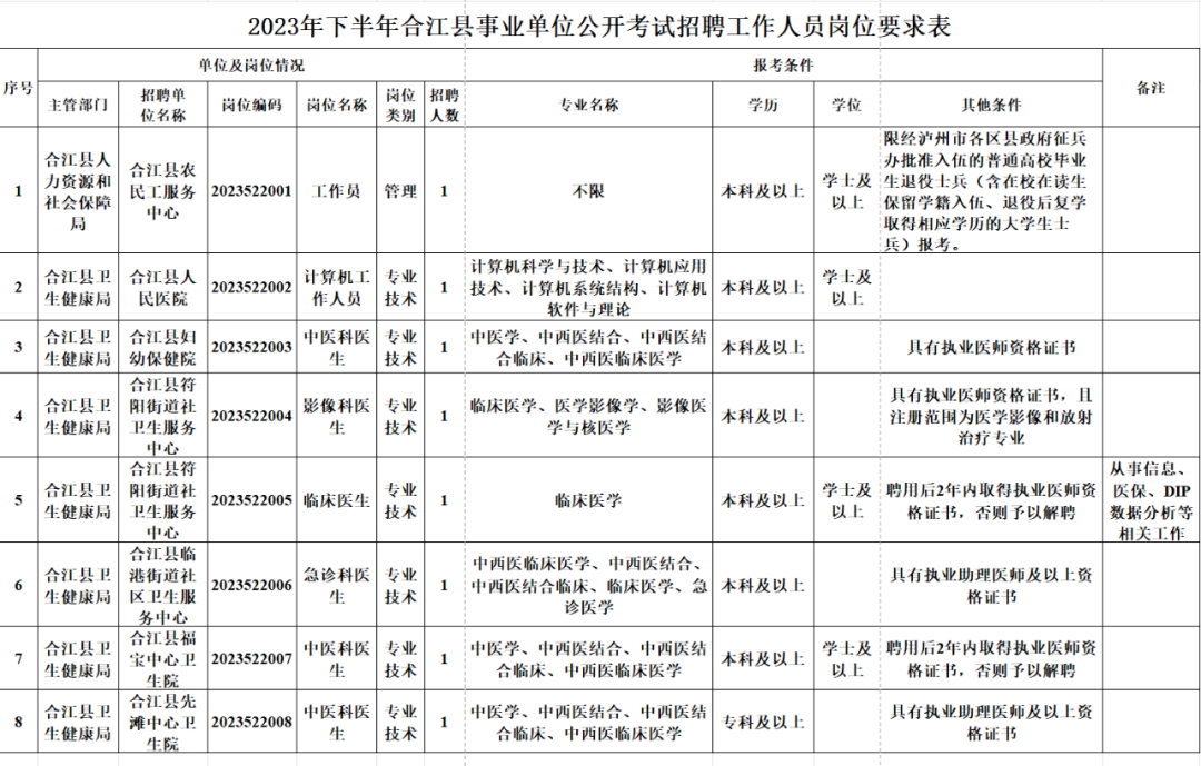 合江县事业单位2023年下半年拟面向社会公开招聘8名事业单位工作人员。