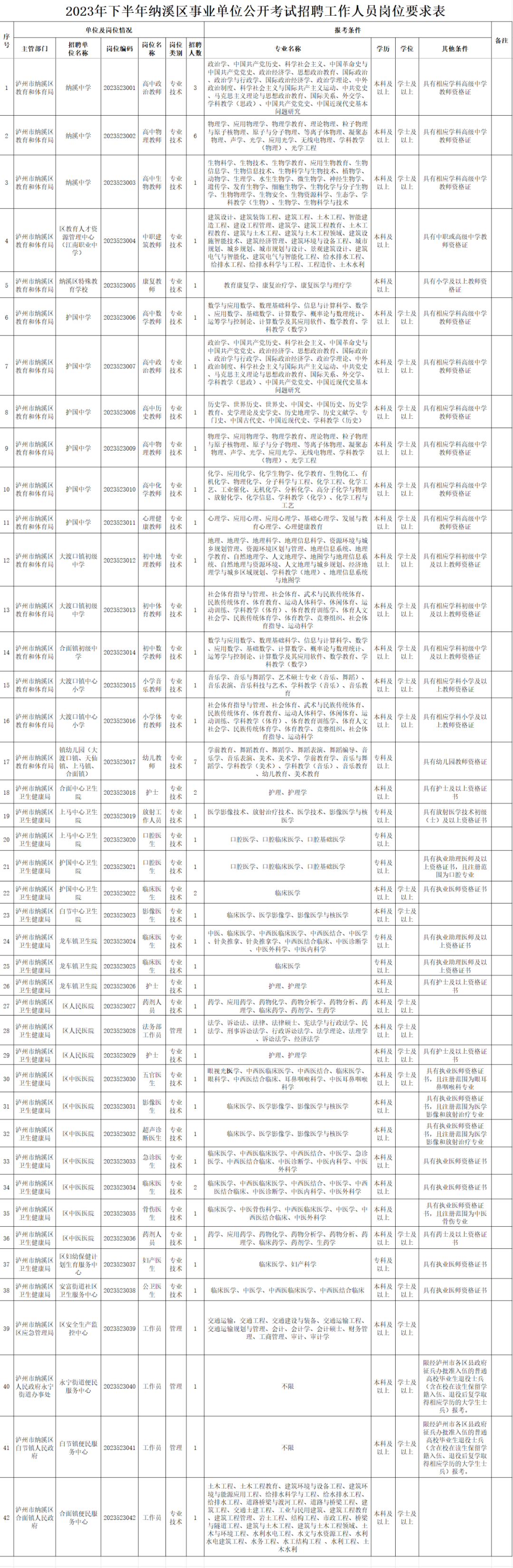 编码2023523006——2023523026,2023523041——2023523042岗位聘用后,在纳溪区乡镇的最低服务期限为5年(含试用期);其余岗位聘用后,在纳溪区的最低服务期限为3年(含试用期)。