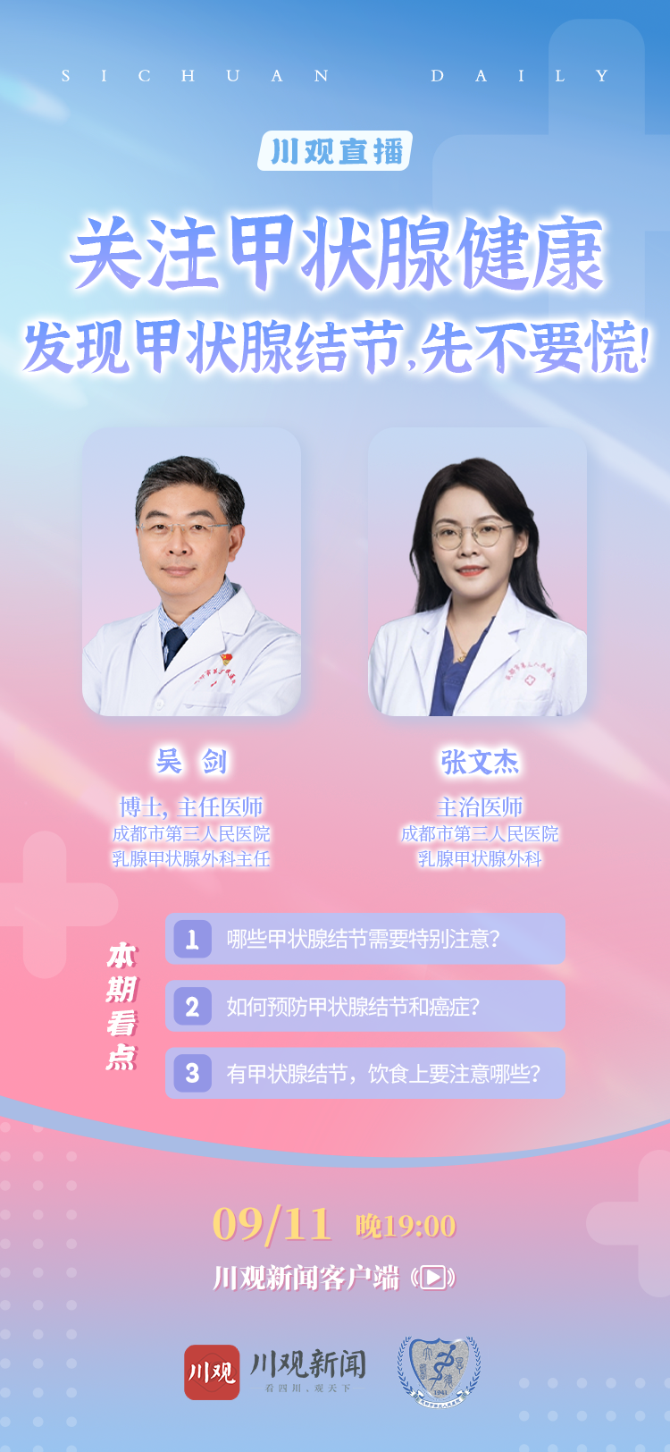 9月11日,川观新闻联合成都市第三人民医院,就甲状腺相关疾病的防治进行科普讲解,给出科学、实用的指导意见,为您答疑解惑。