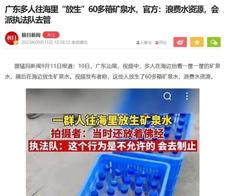 很多人看到这个热搜第一眼都纷纷表示,起猛了,买这么多矿泉水当大自然的“反向搬运工”,这是什么迷惑操作?但只要进一步搜索就会发现,这类新闻早已经不是第一次出现了。小白发现,这样的行为通常被参与者称作“放生”。 今年7月25日,山东青岛崂山水库就迎来了一群放生者,他们同样是倒入大量的瓶装水,经过询问得知,这就是一种参与者口中的“放生”行为。