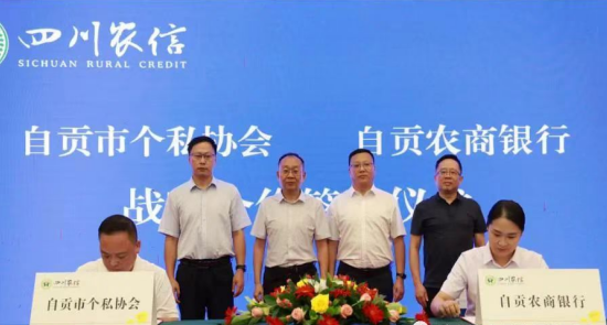 在自贡市市场监管局的推动下,自贡市个私协会、自贡农商银行于9月7日在英祥国际大酒店签订《自贡市个体私营企业协会与自贡农村商业银行股份有限公司战略合作协议》,自贡市市场监管局局长余忠、副局长喻峰,自贡市金融工作局副局长王旭,自贡农商银行董事长张弓,自贡市个私协会会长陈永树出席仪式。