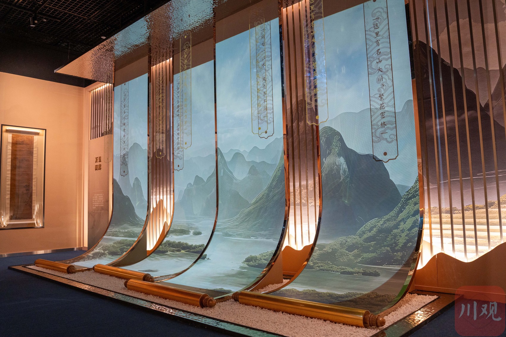 一走进陈列展大门,一股浓厚的长江文化氛围扑面而来。蓝绿的主色调,古画纸色,加之设计时融入的”长江元素”,江水的色彩和流淌的曲线构建出灵动、延伸的空间场景。