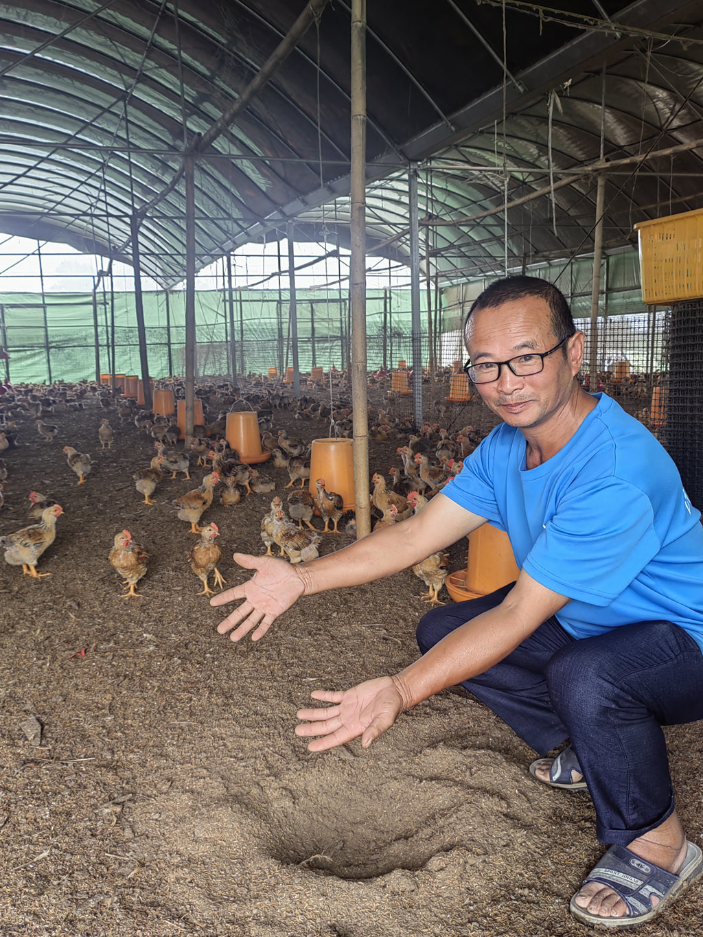 耿成君在大棚里用“发酵床”养鸡。 曾霁 摄
