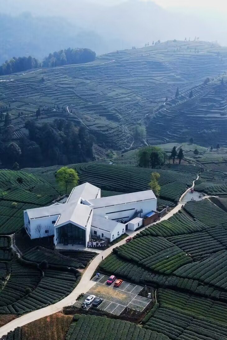 离开 2000万元投资打造的“草言殳舍”,记者又来到同样花2000万元建起的“茶岸”民宿。它的外形像铺在茶山上的五瓣雪花,硬朗的线条和整面墙的透明玻璃,十足的现代风格。