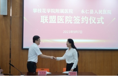 为贯彻国家医改精神,深化公立医院改革,促进医疗卫生资源下沉,落实市委市政府“三个圈层”建设要求,2023年9月7日,攀枝花学院附属医院(以下简称“攀大附院”)党委副书记、院长陈建勋,副院长卿丽华带领耳鼻喉科、肿瘤科、心内科、消化科、神经医学中心专家团队前往永仁县人民医院开展“攀枝花学院附属医院联盟医院”挂牌暨耳鼻喉科邹森专家工作站签约仪式。永仁县医共体总院院长苏美兰,永仁县医共体总院党委副书记夏永江,永仁县医共体人民医院执行院长徐秀琼以及院领导班子成员参加了活动。
