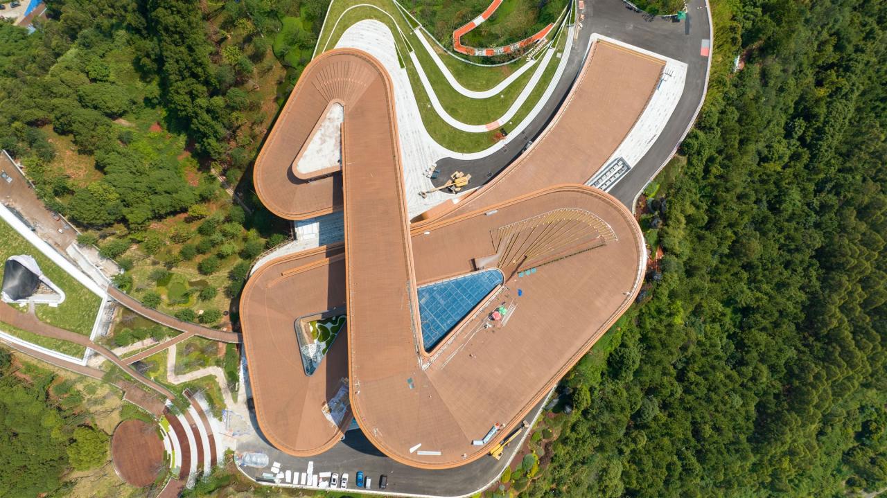 宜宾“三江之眼”位于三江新区龙头山城市森林公园顶端,占地约100亩,最高海拔520米,是一座集城市会客、商务接待、休闲观光、科普教育、生态研学、亲子互动为一体的城市会客厅。站上“三江之眼”眺望,27平方公里龙头山城市森林公园,1500亩竹文化公园尽收眼底,四周植被繁盛茂密,犹如镶嵌于龙头山城市森林公园的一双灵眸,西南方可远眺长江,一览“近城、中水、远山”美景。三江之眼海拔最高点是520米,主要以爱为主题进行空间打造,顶楼打造了“520(Best View)” 打卡型标志。在爬山登上“三江之眼”的路途中设置了3.1314公里的漫步路线,路线两侧将从相遇、相爱、相守采用不同的植物搭配,呈现不同颜色变化。