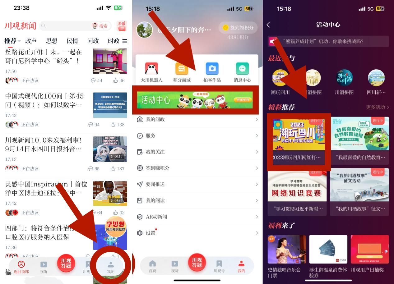 【第二步】在川观新闻首页,点击右下“我的”按钮进入“活动中心”,点击“发现四川新旅游•‘欢乐黄金周’2023潮玩四川网红打卡地推介活动”图片即可参与点赞。