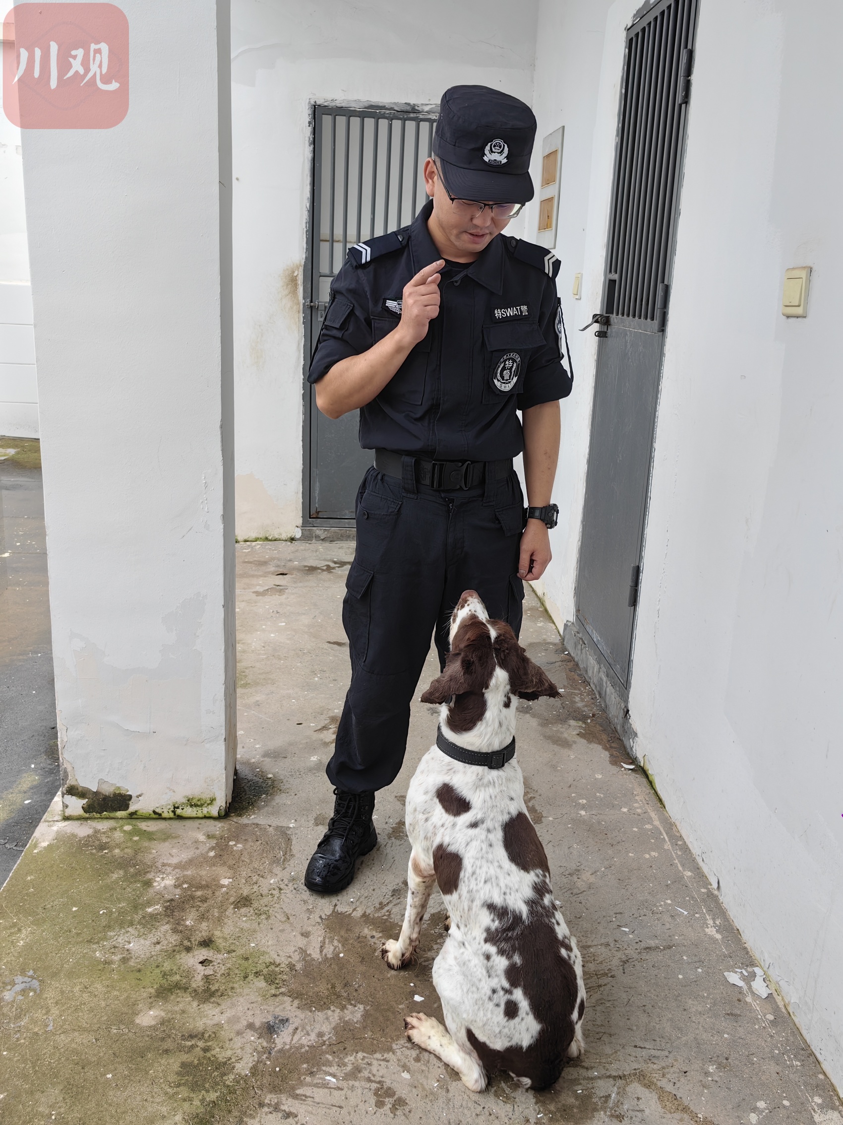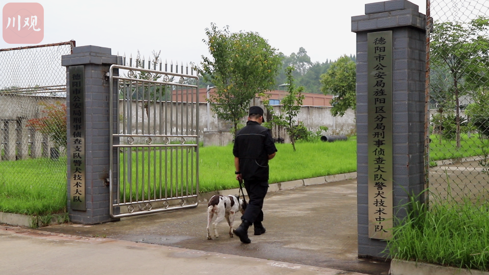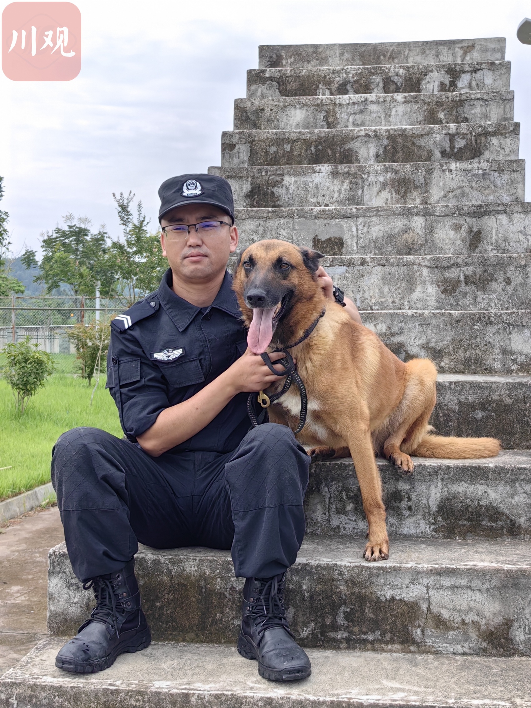 开车从德阳市区出发约5公里,警犬训练基地就在城东郊区一个僻静处。廖玖林在大门口迎接我们。他穿着一身藏青色制服,仔细看,衣服上还沾着不少动物的毛发。帽檐下是一张黝黑的脸,戴着一副黑框眼镜,一脸严肃认真。