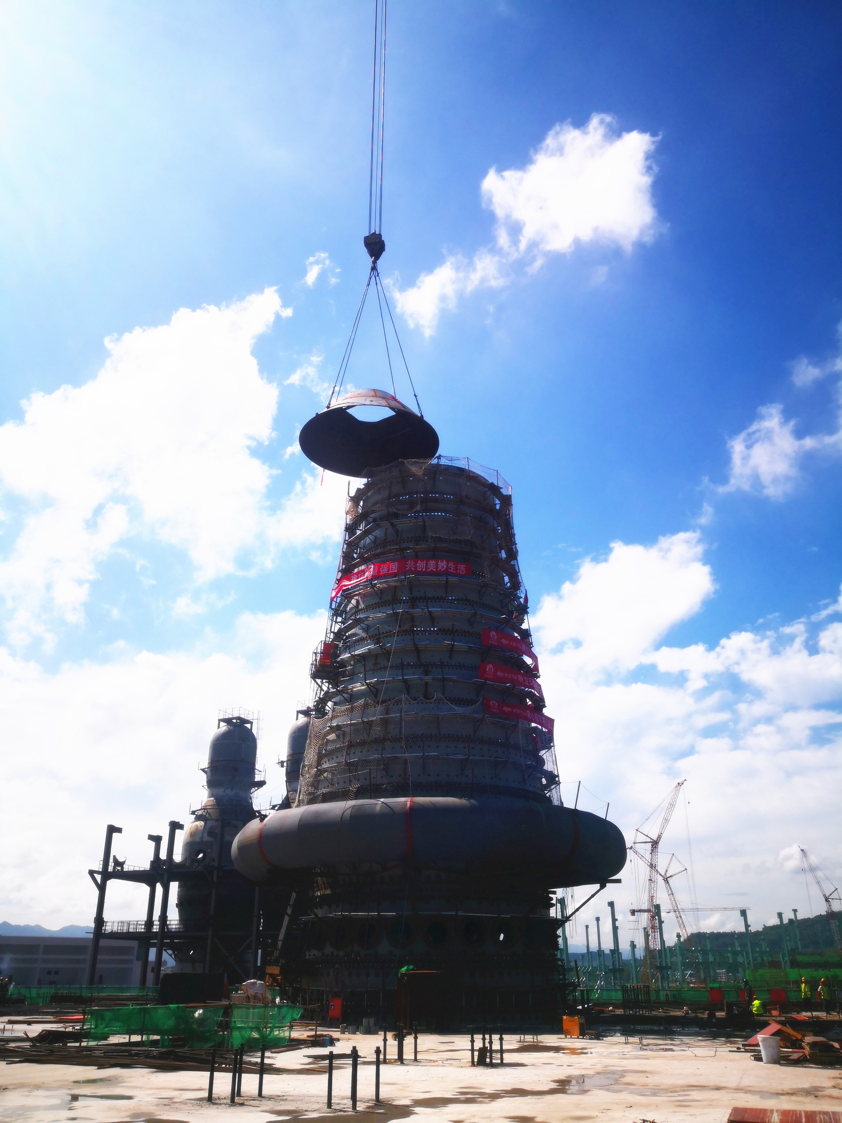 达州钢铁搬迁升级项目1号高炉总高约88米,其中炉体高40米,共分18段炉壳。炉壳是高炉本体的外壳,在完成冷却设备安装和耐材砌筑后将构成高炉冶炼的内型空间,高炉炉料从进料到形成铁水的整个过程都将在此空间内完成。