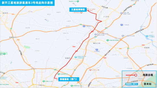 线路走向:熊猫基地(西门)出发,经玉垒路、蓉都大道天回路、蓉都大道天河路、蓉都大道南四段、蓉都大道南三段、蓉都大道南二段、蓉都大道南一段、蓉都大道北一段、蓉都大道北二段、蓉都大道北三段、八阵大道、京昆线、玉林路、九高路、三星堆大道、向新路到达三星堆博物馆站。