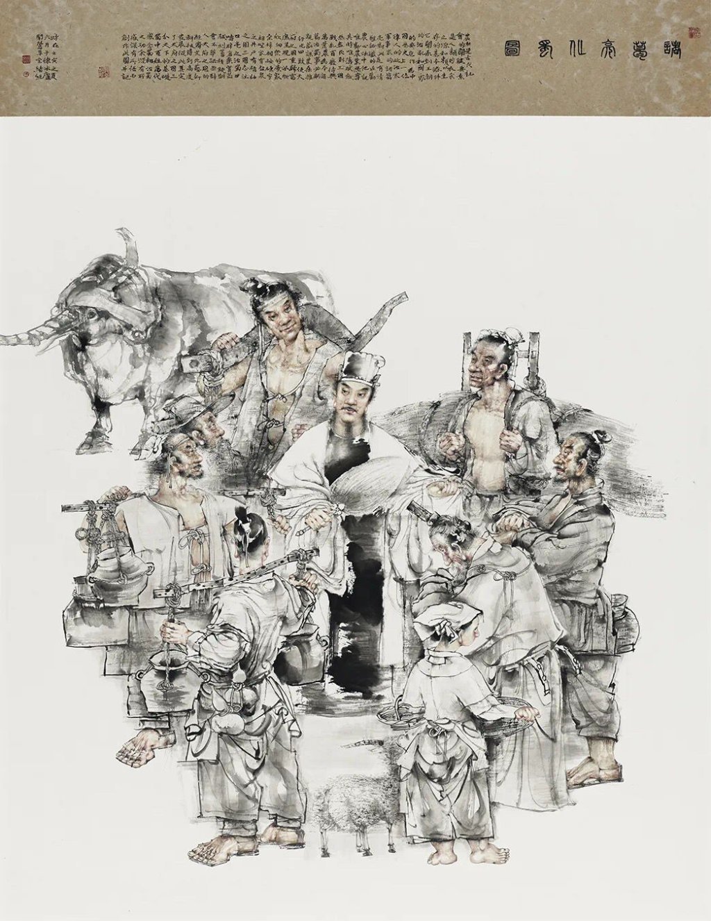 2022年,著名画家吴绪经用了3个月时间,创作完成了水墨人物作品《诸葛亮化蜀图》。他用黑、白、灰,点、线、面的构成,强有力地凸显了大尺幅绘画创作的笔墨意趣。为了避免概念化、肤浅化的表达,他特别注重人物形象的刻画,用团块型的画面构成方法,将身着白衣的诸葛亮融入生活场景,与老百姓谈笑风生、平等交流,体现其治蜀思想。诸葛亮羽扇纶巾的儒雅,农夫的开朗,官员的谨慎,老者安之、少者怀之、朋友信之的感觉溢于画面……干湿浓淡之间,人物形象和个性特征跃然纸上。