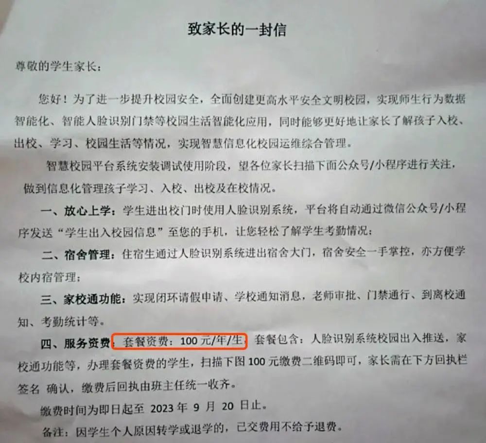 上游新闻记者从《致家长一封信》截图看到,该中学正在安装调试“智慧校园平台系统”,校方称学生进出校门时使用人脸识别系统方便家长了解学生考勤情况;住校生通过该系统进出宿舍大门,方便学校内宿管理;还可实现家校通功能,包括闭环请假申请、学校通知消息、老师审批、门禁通行、到离校通知、考勤统计等等。在资费方面,该系统套餐资费100元/年/生。学生个人原因转学或退学的,已交费用不予退费。