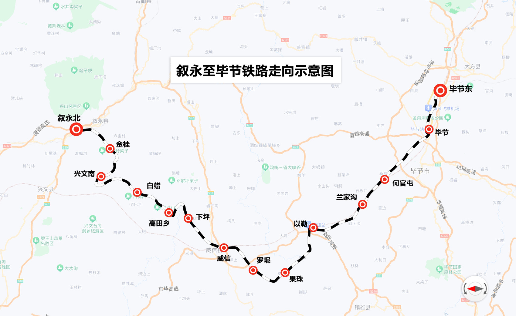 叙毕铁路为国家Ⅰ级单线电气化铁路,是西部陆海新通道的西线通道畅通工程、西南地区至北部湾出海口的最近货运通道的重要组成部分。线路起自既有纳叙铁路叙永北站,向南经宜宾市兴文县,云南省昭通市威信、镇雄县,至贵州省毕节市毕节东站,线路正线全长约189公里,全线新建车站11座,既有站3座,分别为叙永北、金桂、兴文南、白腊、高田乡、下坪、威信(既有)、罗坭、果珠、以勒、兰家沟、何官屯、毕节(既有)、毕节东(既有)。