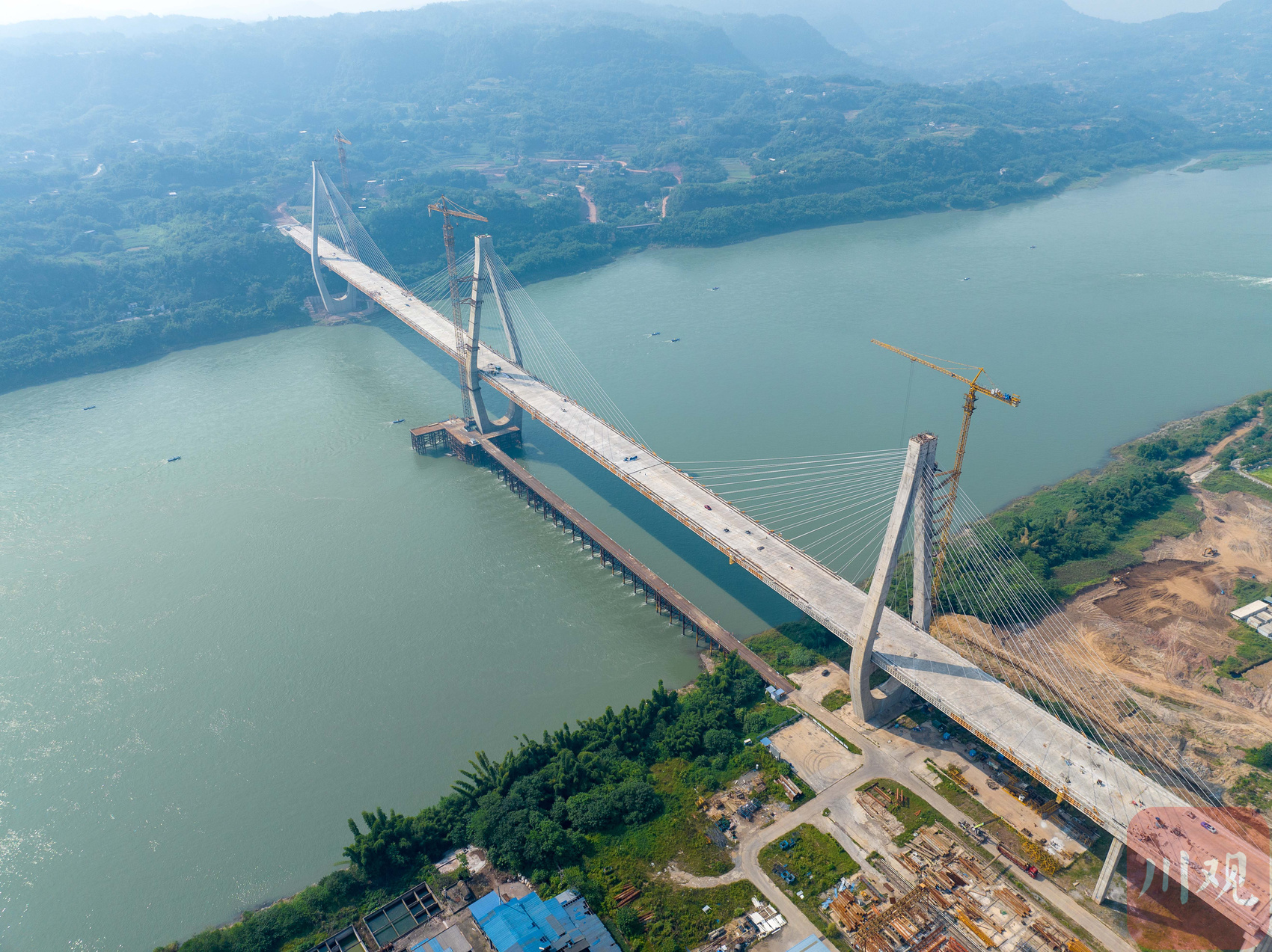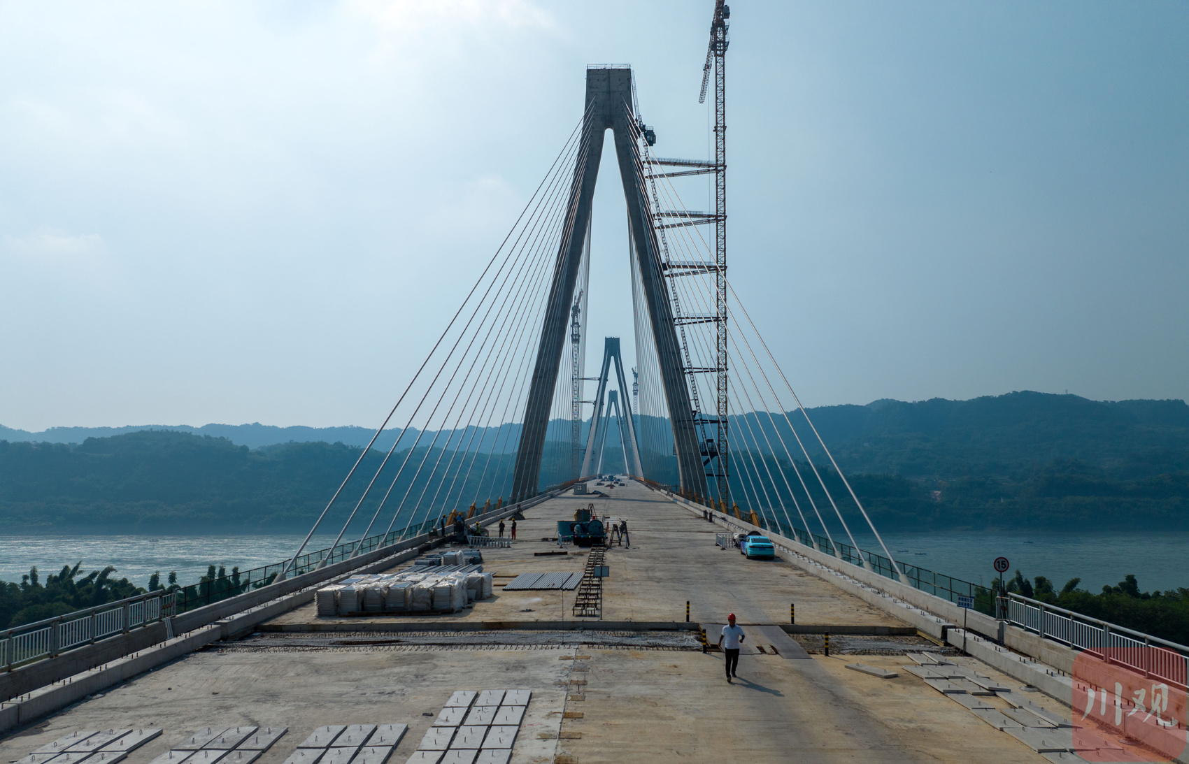 9月15日,在位于宜宾市江安县的长江二桥项目施工现场,数十名工人正在桥上进行桥面预应力、斜拉索调索施工,大桥两侧的护栏也正在装配调试。该桥预计将在12月建成通车,届时从江安化工园区(经开区)过江将节省20公里路程。