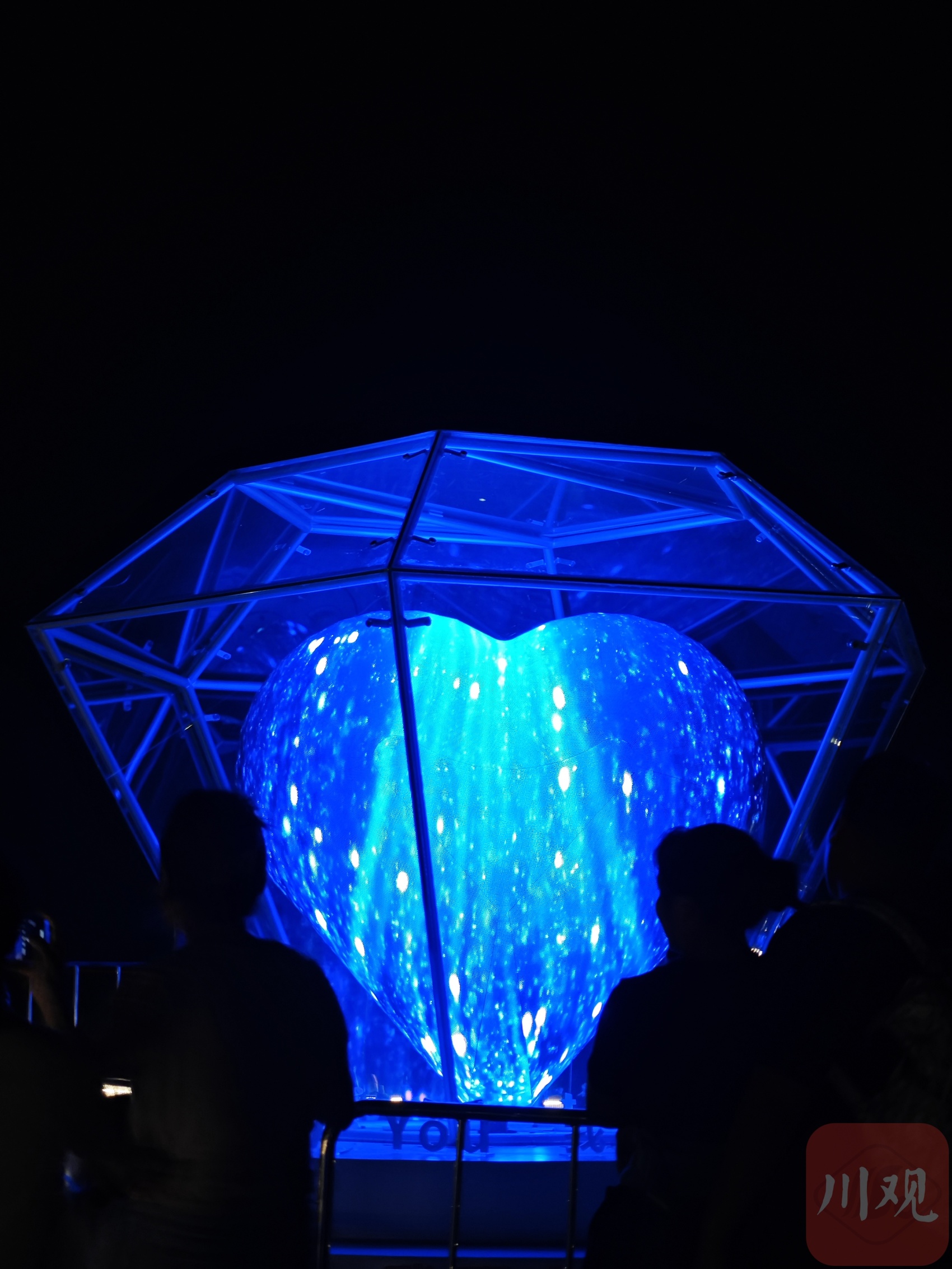 9月14日晚,亮灯后的宜宾“三江之眼”仿佛一颗明珠镶嵌在龙头山森林公园。在其顶端,主体钻石造型与立体心型屏相组合的“城市之心”耀眼夺目,人们吹着晚风,纵览宜宾城市夜景,舒适又惬意。
