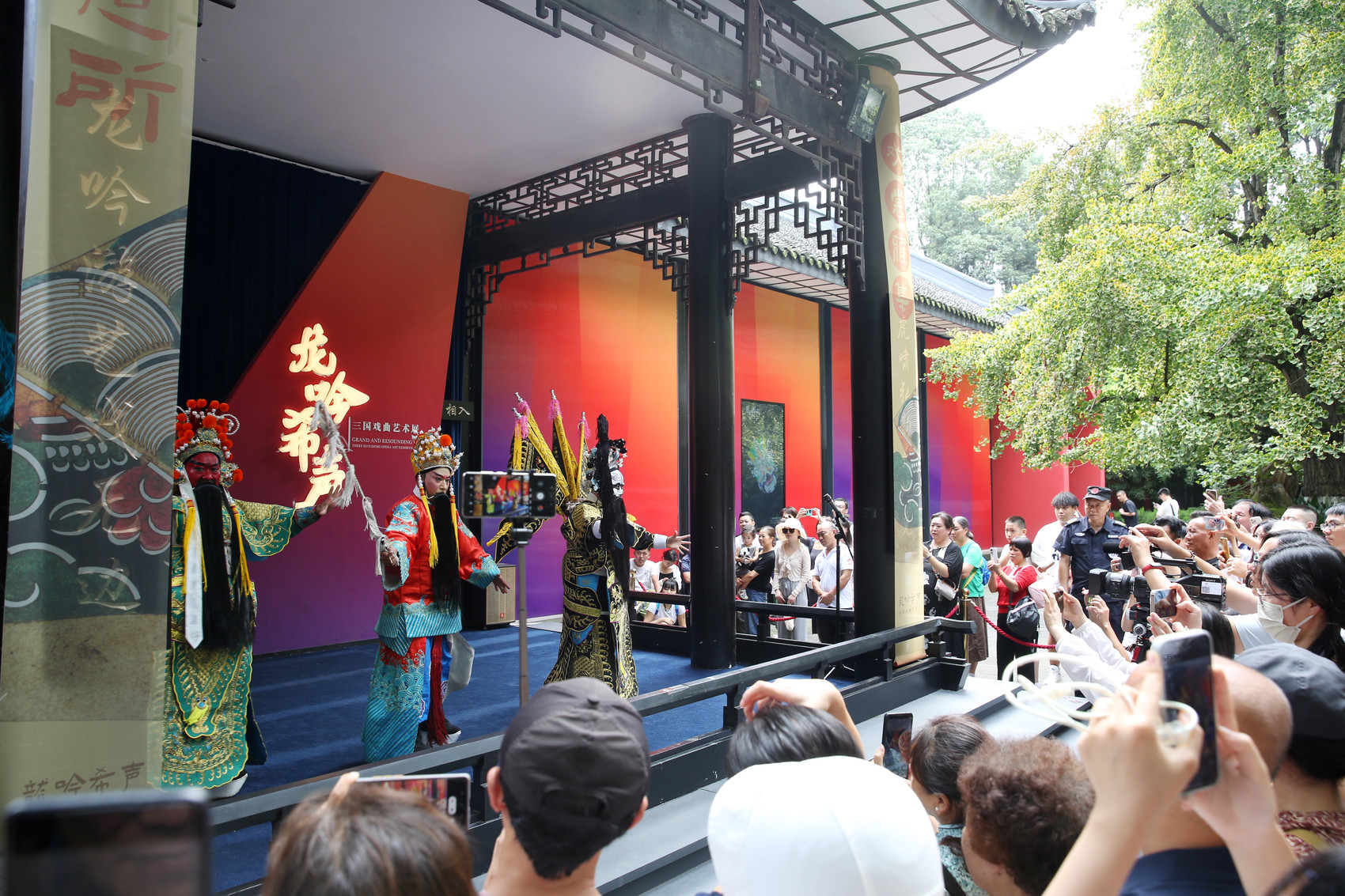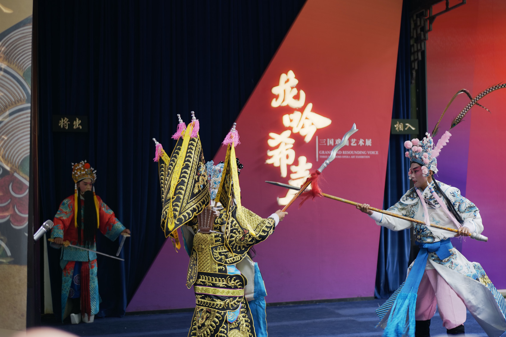 9月16日,成都武侯祠博物馆“龙吟希声——三国戏曲艺术展”展厅前人头攒动。当天下午,伴随着一声高腔开嗓,来自三花川剧团的青年川剧演员逐一登场,为观众献上《桃园三结义》《三英战吕布》等三国主题川剧表演。转身回头、锵锵唱腔,演员们的飒飒身法引得台下观众接连叫好。