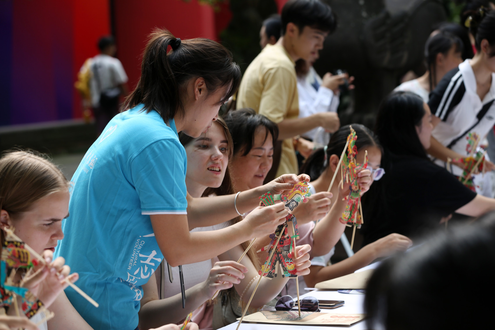 除了三国戏演出,当天下午,成都武侯祠博物馆还面向观众推出戏曲变装和皮影制作等体验活动。经专业老师的妆造后,有的观众摇身一变成为三国历史人物,重新在武侯祠内寻三国、道三国。此外,观众还亲自参与刘备、关羽、张飞和诸葛亮四位蜀汉英雄人物的皮影形象制作,体验非遗民俗文化,感受手工制作乐趣。