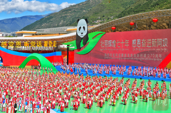 数千人早早相聚,期待一场盛大庆典——阿坝藏族羌族自治州成立70周年庆祝大会在这里举行。人们脸上洋溢着笑容,打着欢快喜悦的节拍。