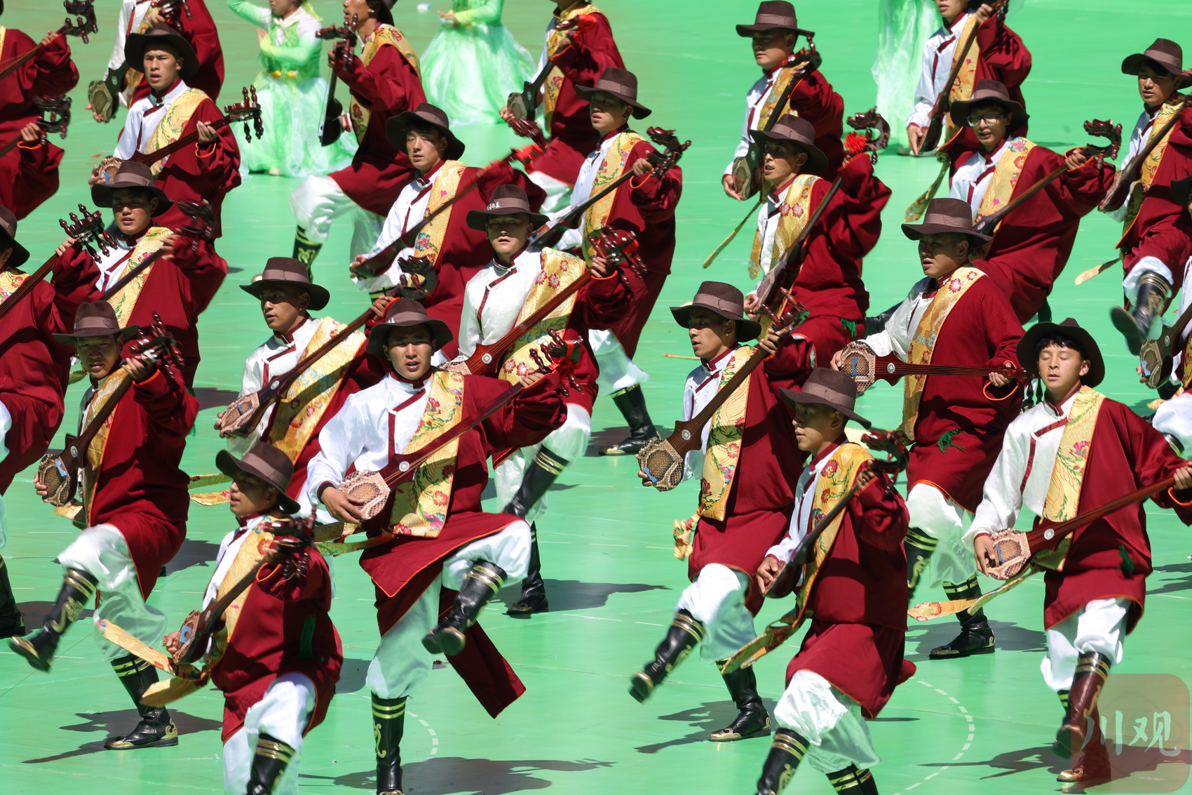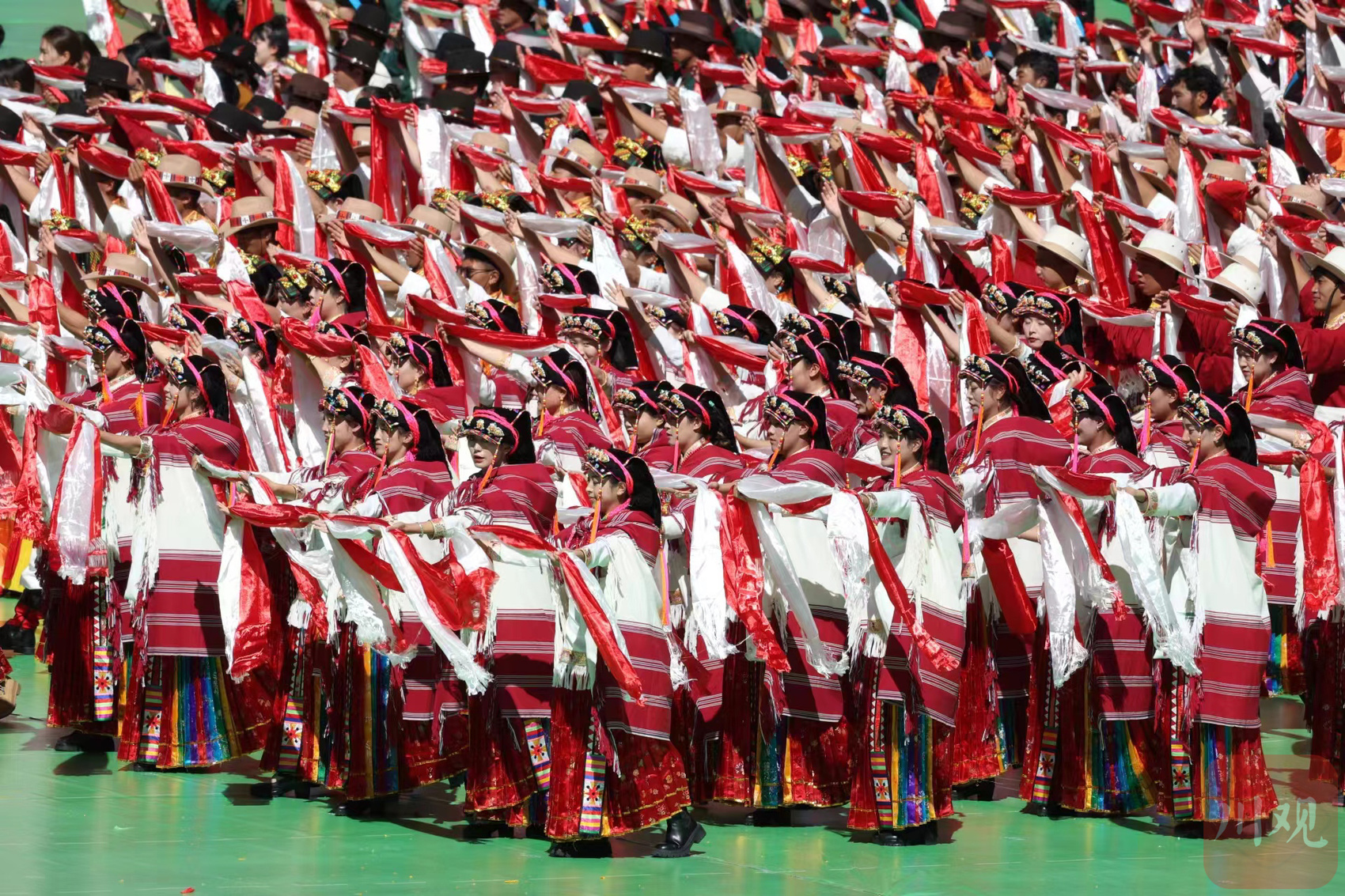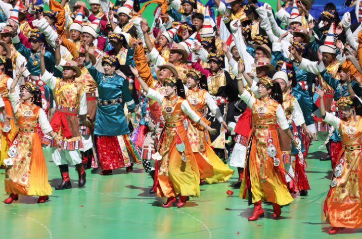 整场演出将民族文化贯穿始终。“汇集了阿坝州的大部分非遗歌舞项目,观众也是来自阿坝各个县(市)。”阿坝州文化馆馆长俄玛塔说,参演人员超过7000人,这个“大家庭”共同将传统歌舞呈现给观众。