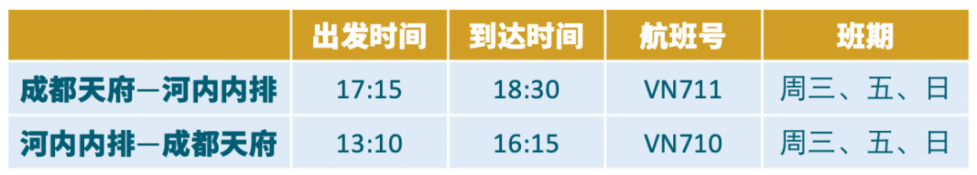 每周三、五、日,越南航空一周三班从成都天府国际机场往返越南河内内排机场,采用空客A321执飞。
