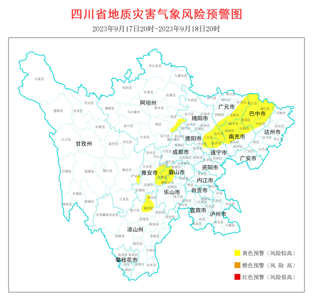 9月17日,四川省地质灾害指挥部办公室发布全省地质灾害气象风险预警。根据四川省气象台天气预报情况,结合四川省地质环境条件,9月17日20时至9月18日20时,全省地质灾害气象风险黄色预警区域为广元、绵阳等13市(州)的37个县(市、区)。
