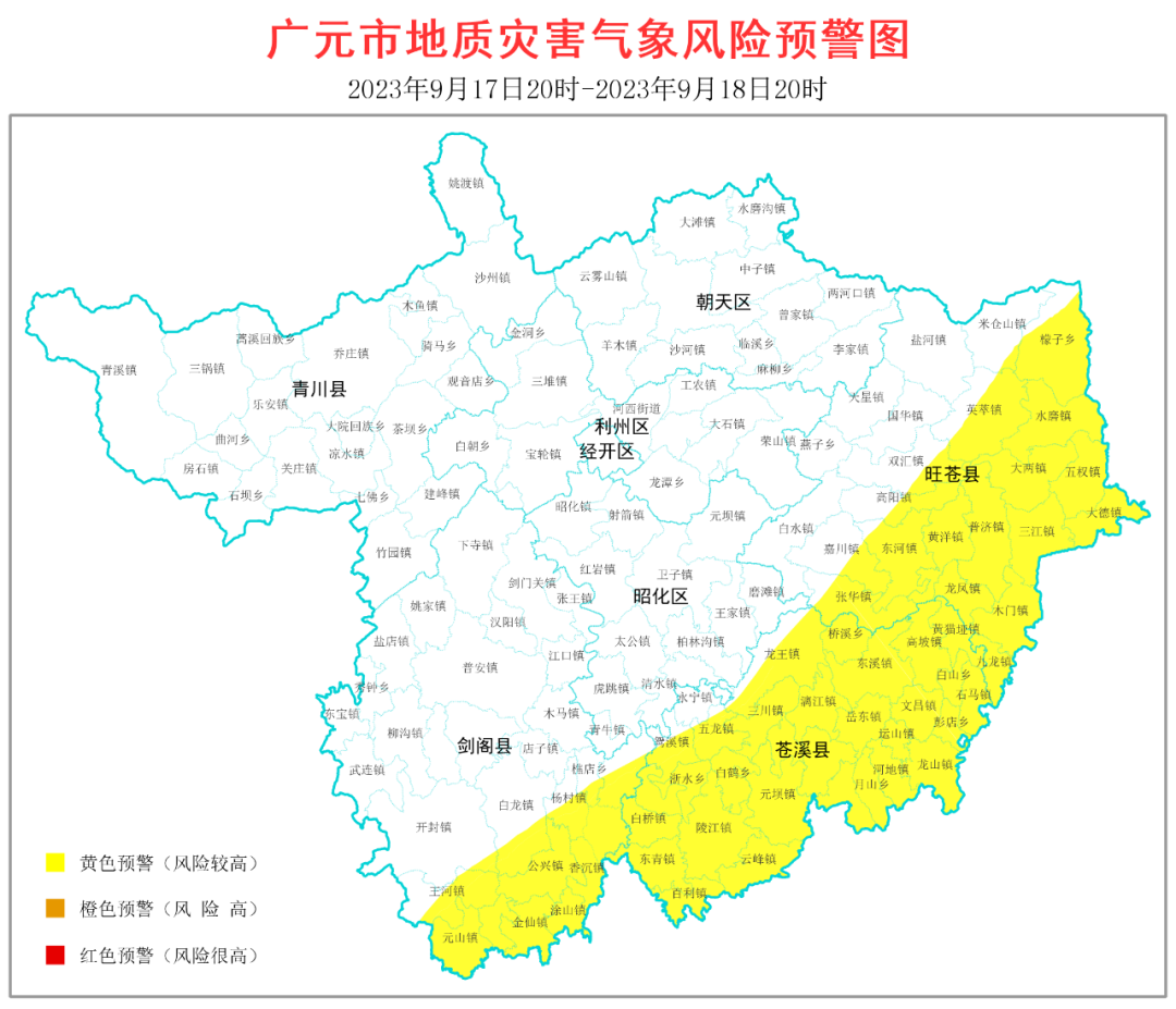 广元市地质灾害指挥部办公室发布地质灾害气象风险预警:根据气象部门天气预报情况,9月17日20时-9月18日20时,苍溪县全境、旺苍县东河镇等18个乡镇、剑阁县开封镇等12个乡镇发生地质灾害的风险较高(黄色预警)。